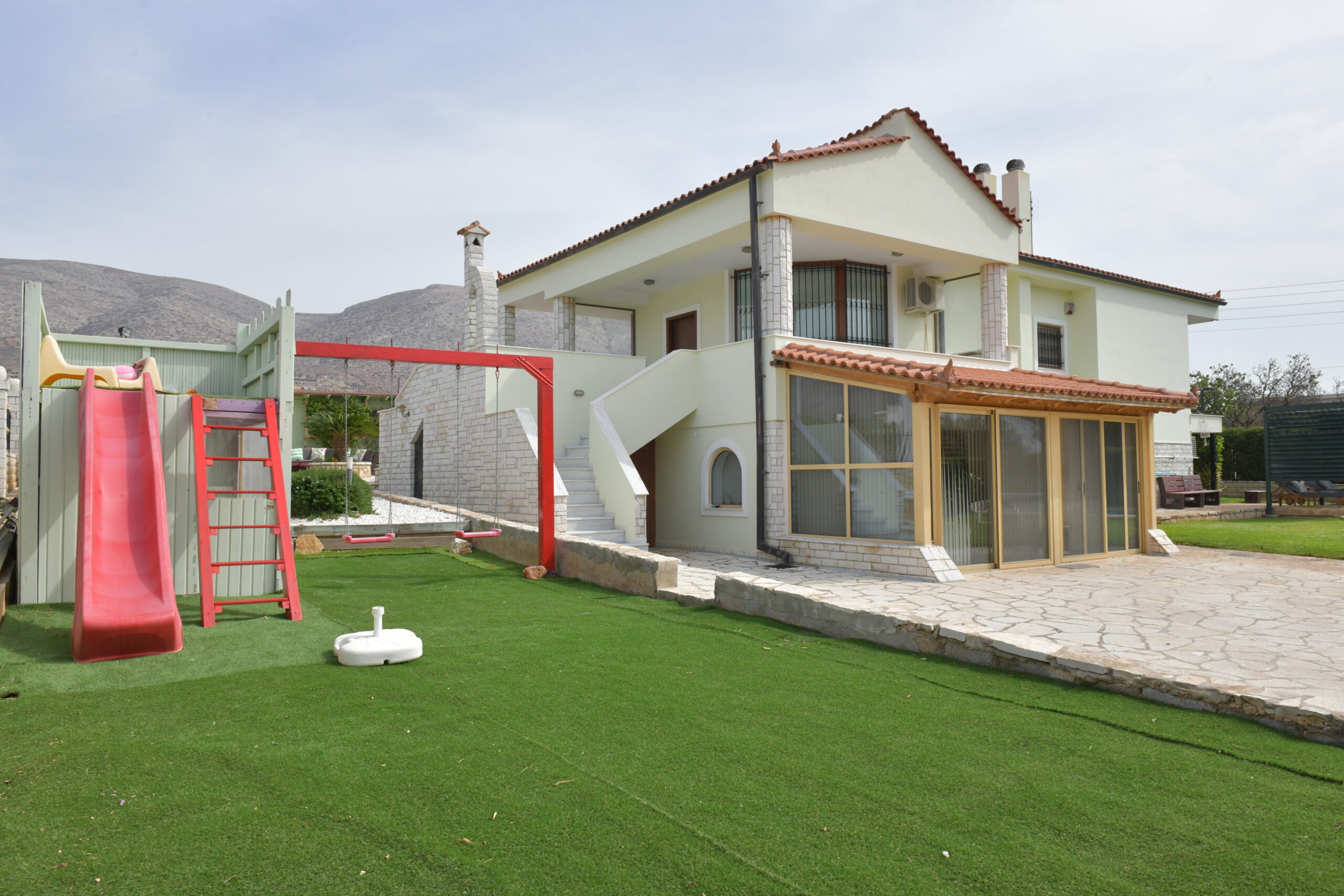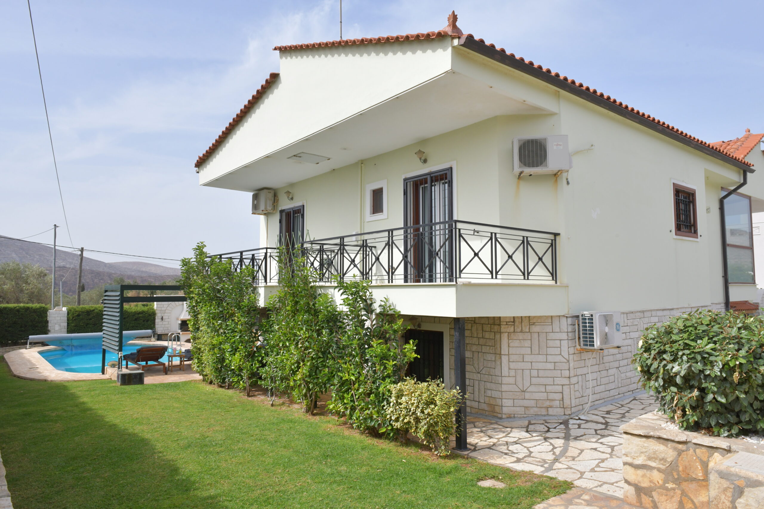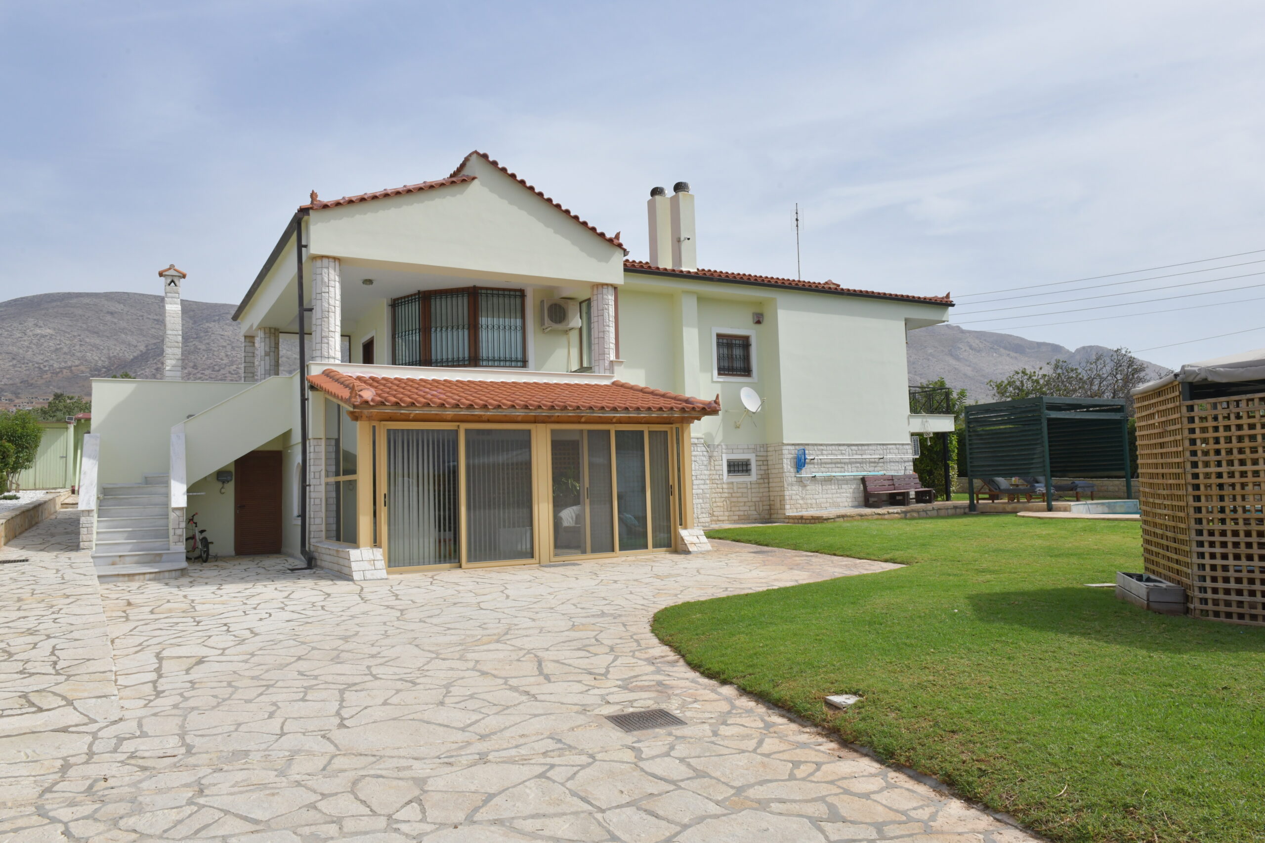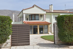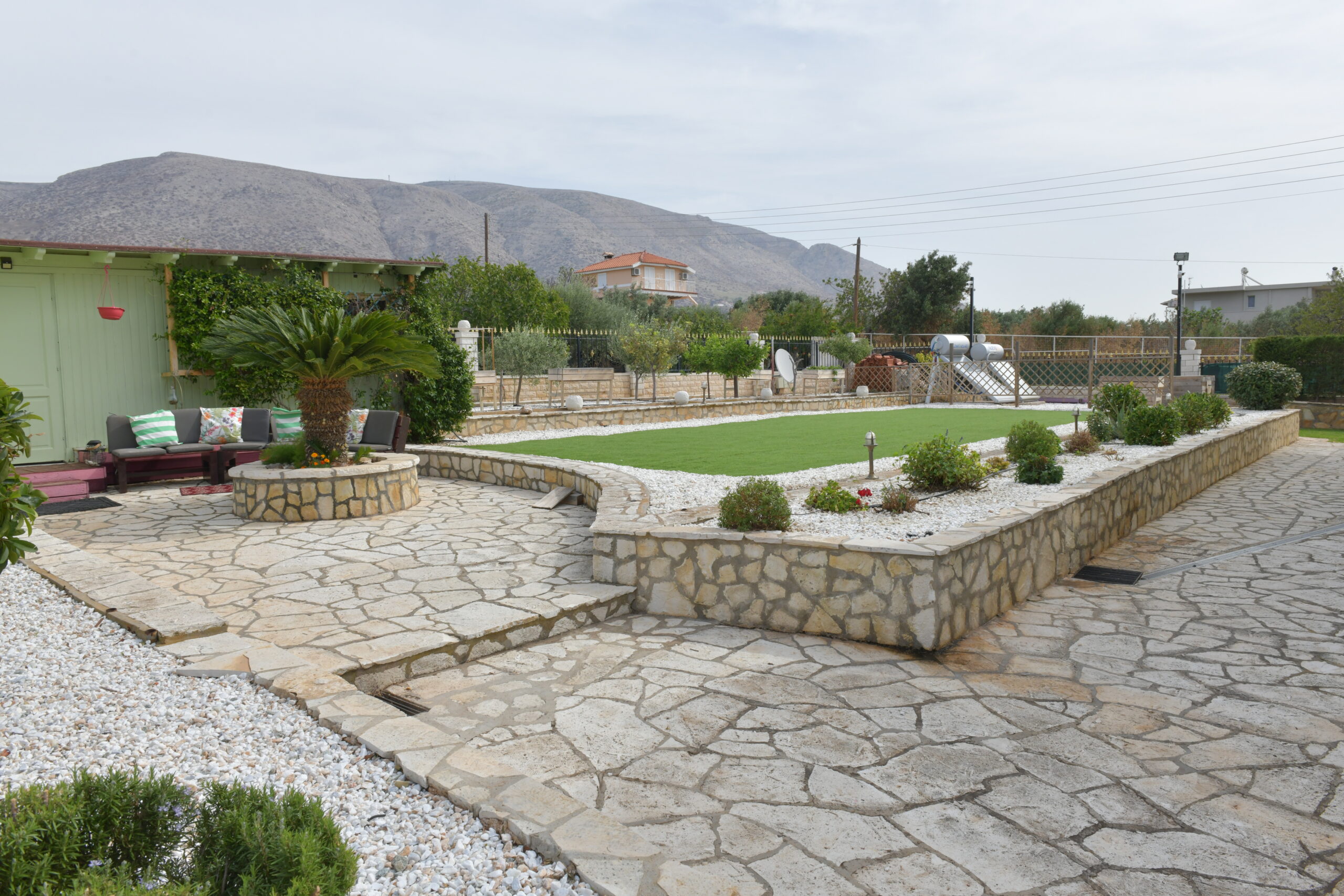 The home enjoys a dual-aspect orientation: to the north, it is framed by peaceful mountain views, while to the south it offers partial sea views, scenic mountain surroundings, and open outlooks over olive groves—creating a truly relaxing and picturesque setting. landscaped plot, featuring a beautifully maintained, sculpted garden with olive, lemon, and apple trees.