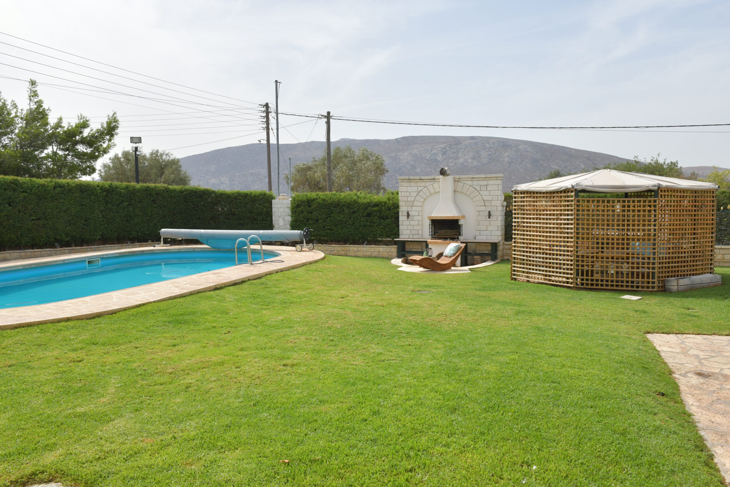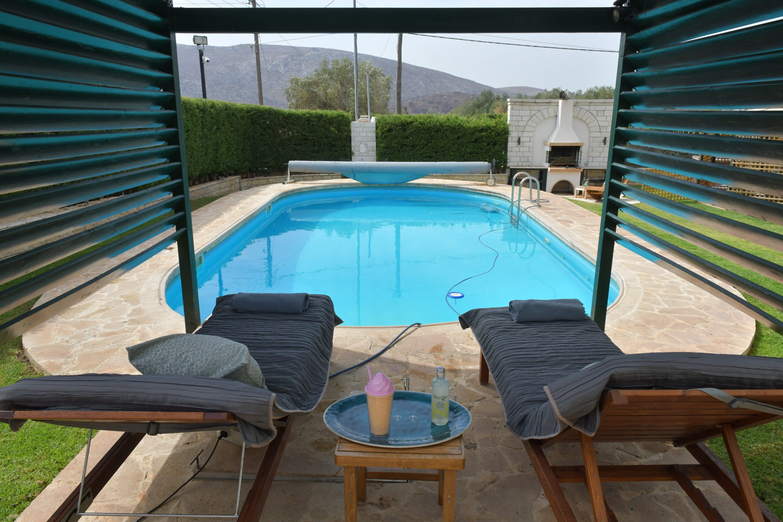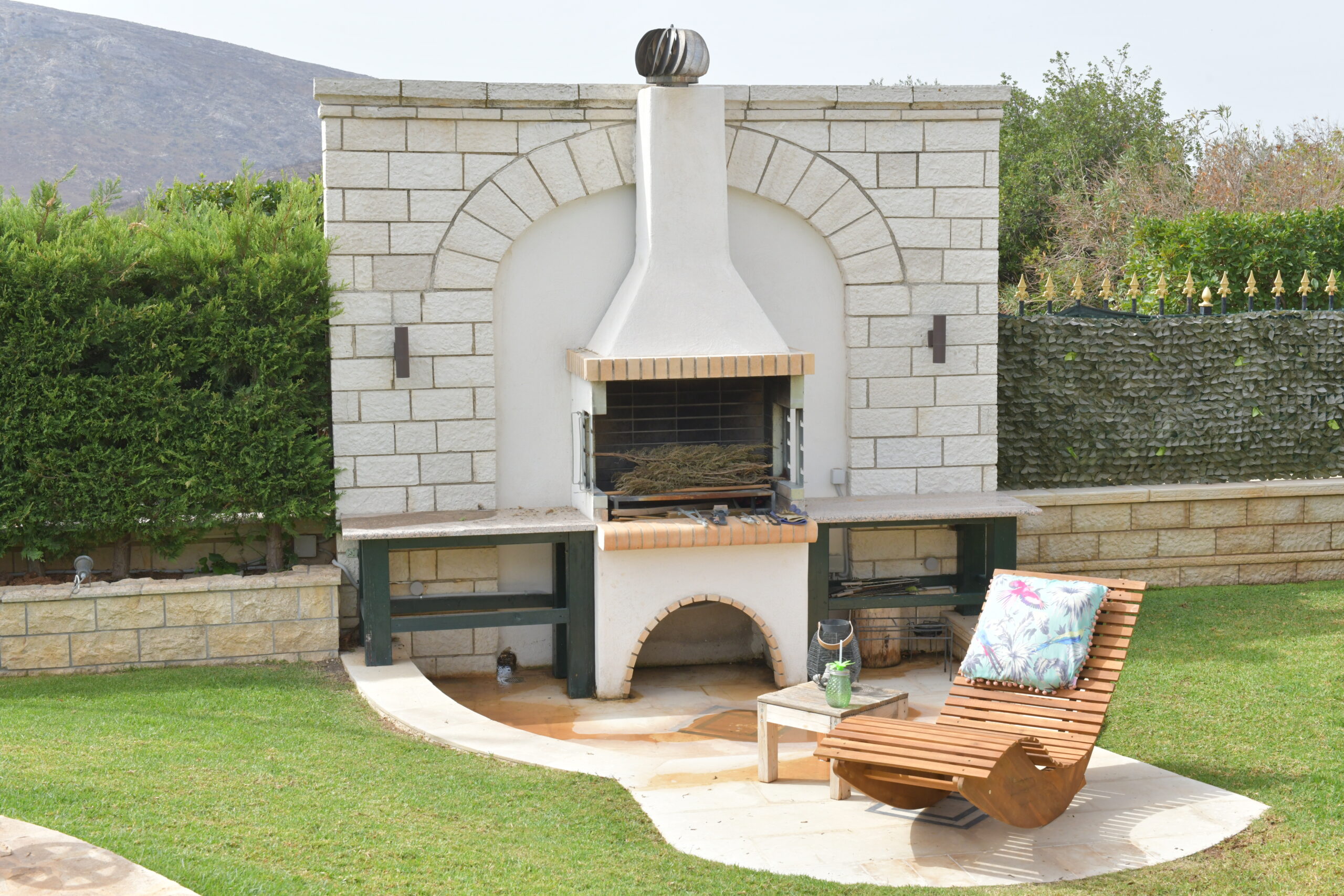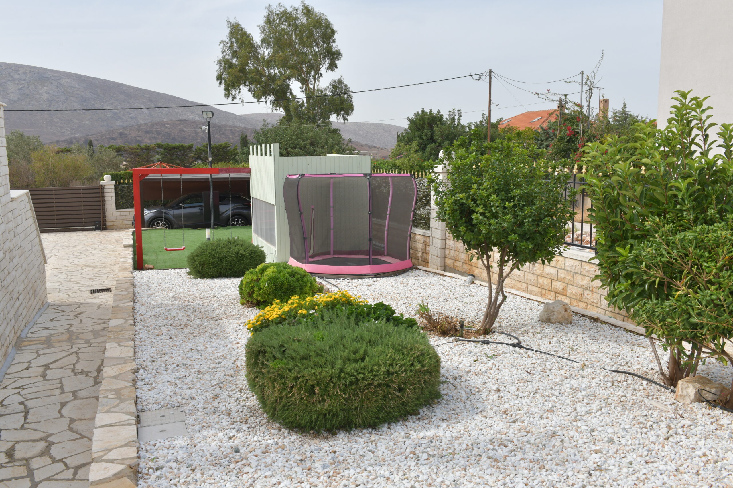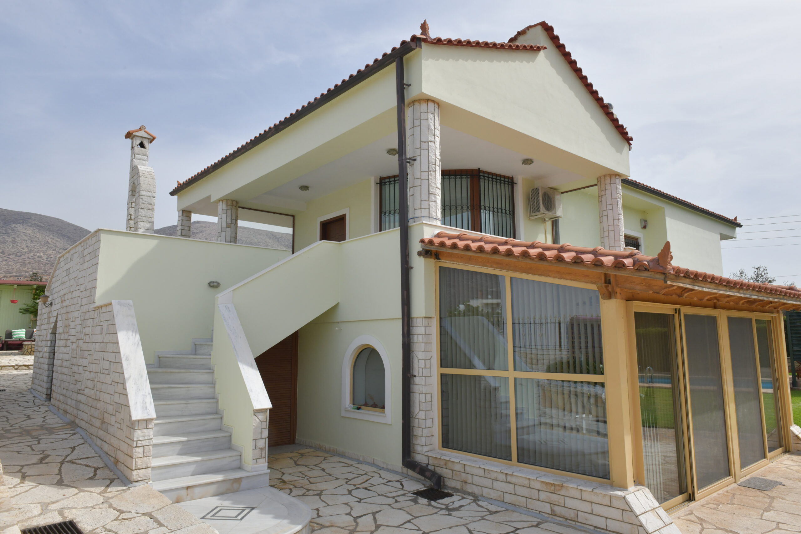 The home enjoys a dual-aspect orientation: to the north, it is framed by peaceful mountain views, while to the south it offers partial sea views, scenic mountain surroundings, and open outlooks over olive groves—creating a truly relaxing and picturesque setting. landscaped plot, featuring a beautifully maintained, sculpted garden with olive, lemon, and apple trees.